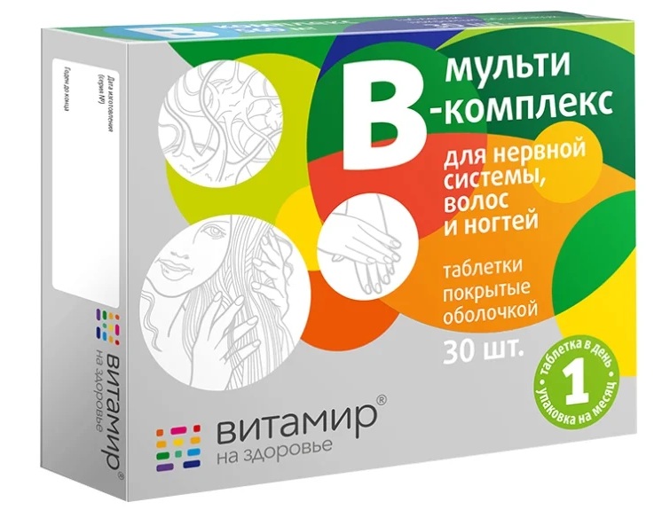 Multi B-complex Vitamir tab. p / o No. 30 is designed to improve the condition of the skin, hair and nails, as well as the nervous system. It is intended for people aged 18+. It is used as a biological food supplement, as an additional source of B vitamins, inositol, para-aminobenzoic acid containing choline.