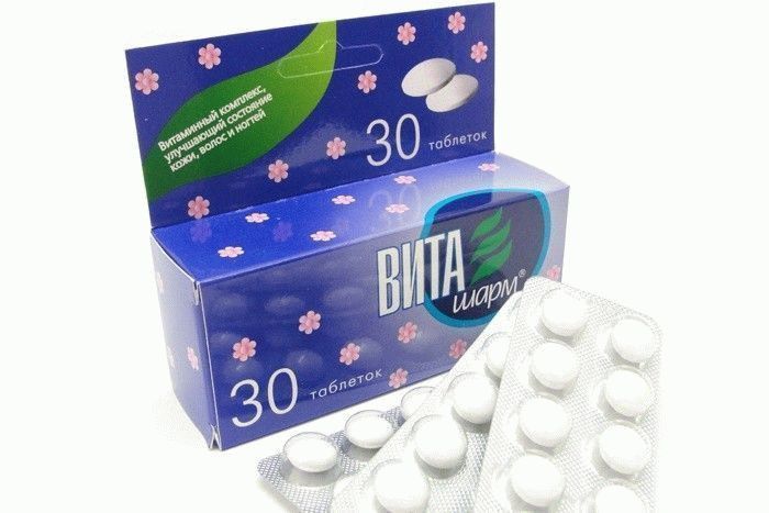 The main difference between this mineral complex of vitamins is that, despite the poor composition, it works quite well. Vitasharm's ingredients list includes several vitamins, calcium patentotenate, nicotinamide. As a result of its intake, the skin becomes denser, elastic and taut. In addition, hair ceases to crumble and nail plates stop peeling.