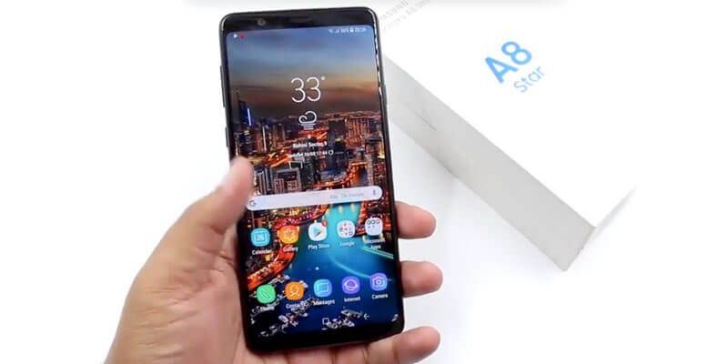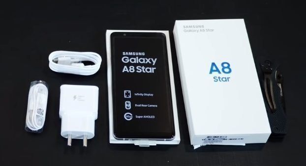 The Samsung Galaxy A8 Star is packed in a regular white cardboard box.