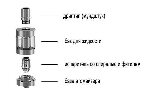 The first type allows you to adjust the traction resistance, saturation by the modernization method and various windings. There is a liquid reservoir inside the evaporator. The best models of atomizers have a base with a heating element in the form of a spiral with a wick. The spiral can be picked up at the vape shop. A reservoir or tank of different capacities is located above the base. It holds 2-10 ml of liquid, which rises through the slots and holes up the wick and goes out to the heater.