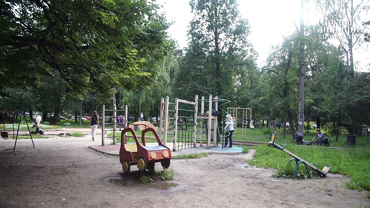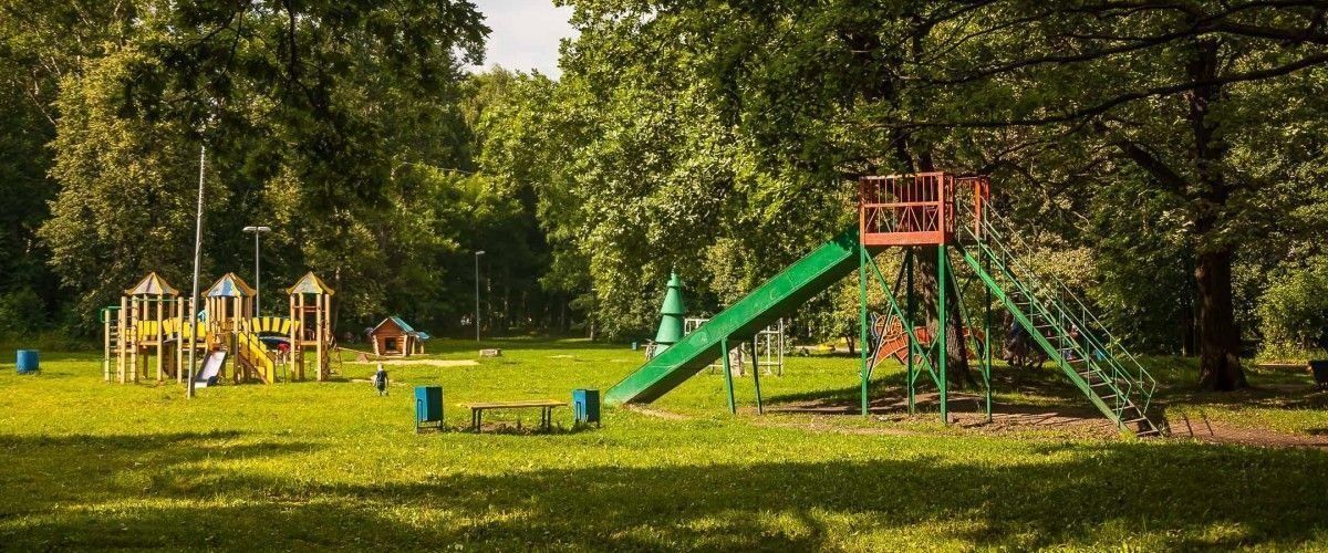 In the center there is a multifunctional complex with horizontal bars, bridges and slides. But there is a smaller sector where chain horizontal bars are installed. There is a stage for performances on the site, next to which a sports area is equipped. The new wooden houses and wells are very attractive for children. The old iron swings and merry-go-rounds have survived - they are being tinted in time, so they don't remember the big picture.