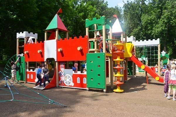 The play area is interesting with a stylized Kremlin, a rope trainer, slides for young and middle-aged children. Teenagers and even adults will help you train on the horizontal bars. There is also enough space for walking with a stroller.