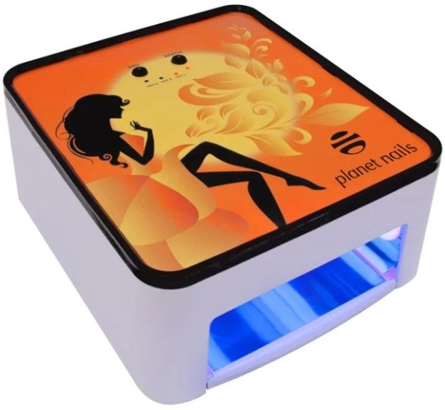 The top panel features a stylish girly design. Fixing the cover is provided by 4 lamps and the power of the device is 36 W. There is a mirrored reflector and a pull-out panel. This device can be used for both manicure and pedicure. There is a timer where you can set the time in 60, 120 and 180 seconds. The body is plastic.