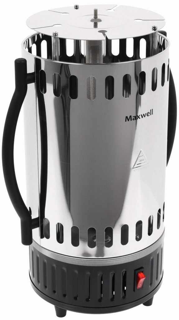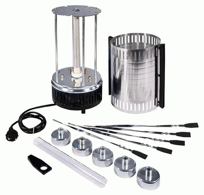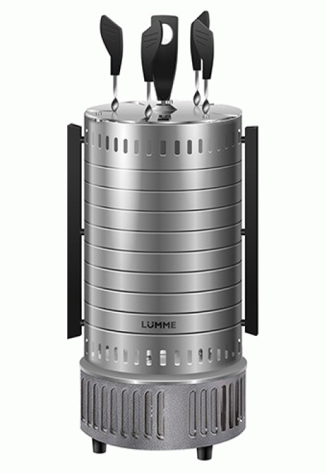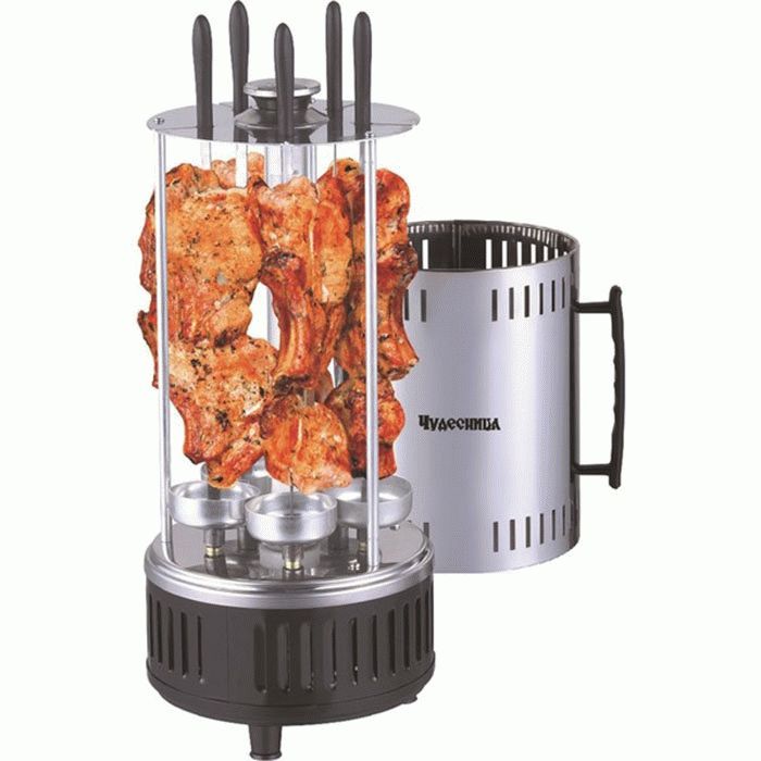 This device can be black or silver. The material from which the case is made is distinguished by its durability, since it is stainless steel.The heating element is standardly located in the center, the skewers, during cooking, rotate around it. Power 1200 W. There is a work indicator light, there is no countdown timer. There is a convenient handle for carrying. Skewers 5 pieces.