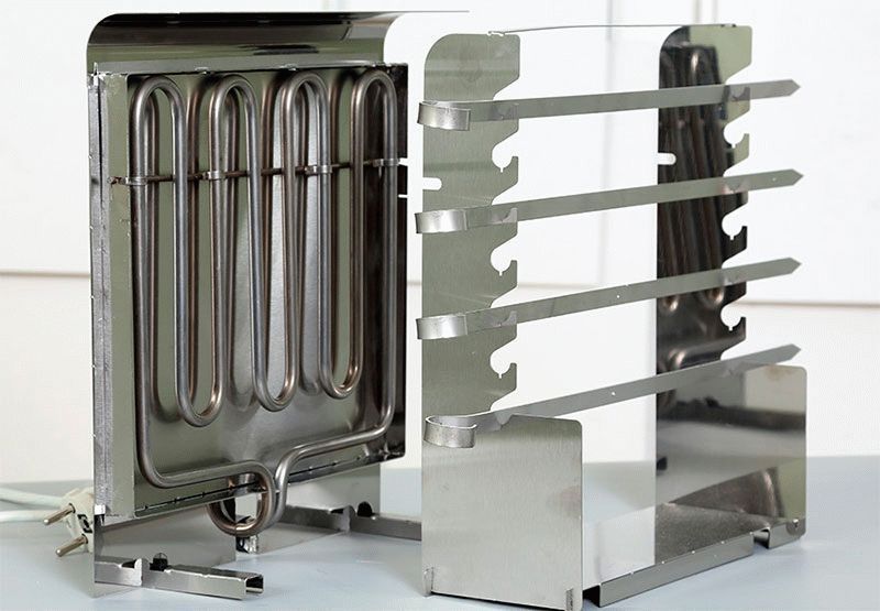 This appliance is made of stainless steel. The exterior is rectangular with two panels, on each of which there are barbecue racks and a heating element. Unlike a vertical barbecue, here the skewers are placed horizontally.