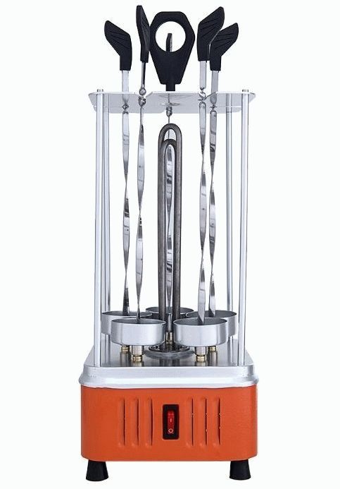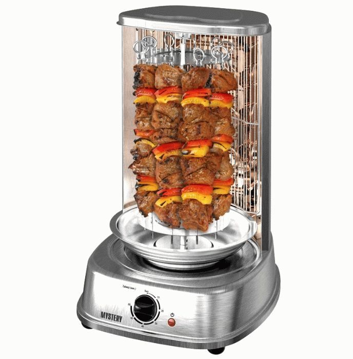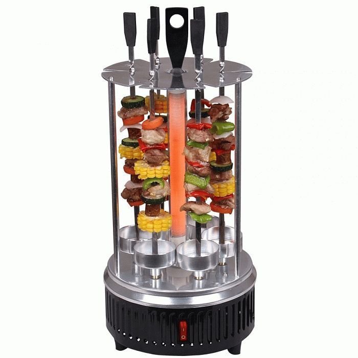 The device may differ in shape, as there are horizontal and vertical models. They differ in that the vertical technique has a cylindrical shape, inside which a heating element is located. Skewers are inserted into special cups and then rotated around the heating shade. Melted meat fat flows down and accumulates in mini-containers. After cooking the kebab, you can sprinkle it with this fat to add juiciness.