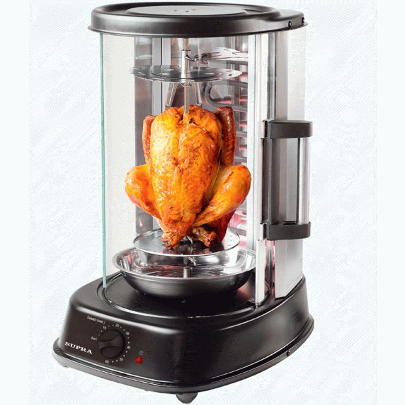 The declared power is 1400 W. There is a large skewer inside the appliance, on which you can fry small pieces of meat or bake chicken. The peculiarity of rotating skewers is that they do not just revolve around their axis, but sometimes approach, sometimes move away from the heating element.
