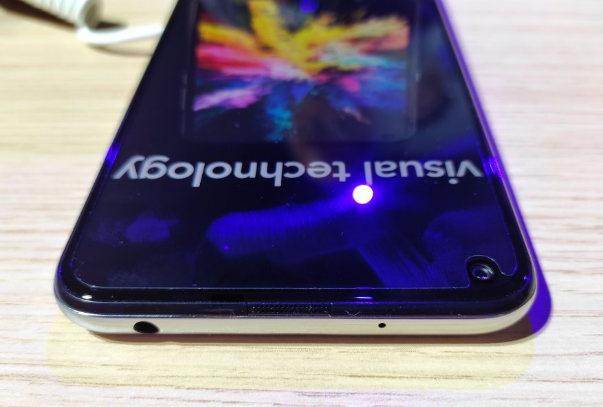 In accordance with the latest fashion trends, the front camera is located directly in the screen, while its location is non-standard - near the left edge.