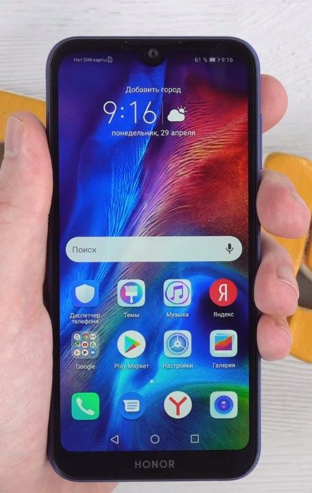 On the front surface in the middle there is a teardrop-shaped notch where the front camera is installed. Above the camera there is an earpiece microphone grill, a light and proximity sensor, below there is a small chin with the Honor logo, virtual navigation buttons. On the top there is a headphone jack, a microphone, a microUSB port and a speaker at the bottom. The volume rocker and the power button are located on the right side, on the left is a slot for a memory card and SIM cards.