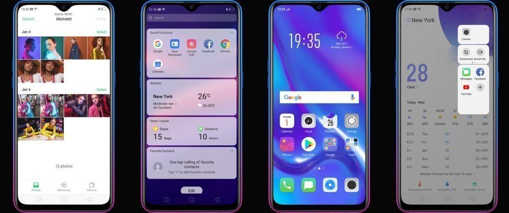 The shell, as usual, resembles iOS in design - the folders are similar, the icons are also rounded, there is no application menu, everything is located on the desktop. If you scroll to the side, a menu for widgets appears, which can be found in the iPhone or in Chinese devices with their own shells. But there is also some originality in Color OS. Everything works quite fast - screens scroll without brakes, applications start quickly.