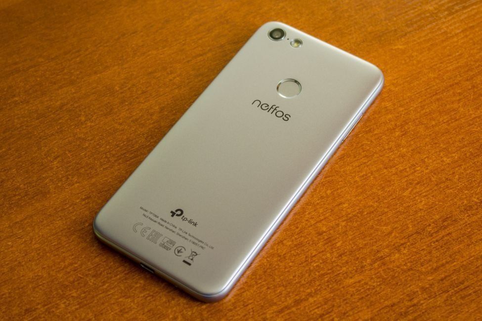 Additional microphone for video, flash and rear camera lens in a silver frame. It looks elegant. The fingerprint scanner and the Neffos brand logo are located just below. The very same inscription from TP-Link is displayed at the very bottom of the phone cover.