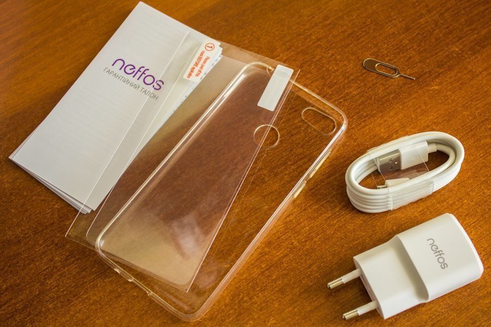 The phone comes in a large branded box. It contains a standard set, as well as additional USB / MicroUSB cables, clips for removing SIM cards, a power adapter (5V / 1A), as well as a protective film on the screen and a transparent silicone case.