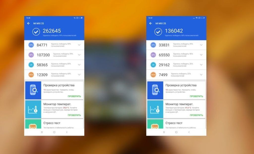 In the synthetic test Antutu Benchmark gives out 262 645 points, but after passing several levels in "Tanks", downloading applications and watching videos, the test result has already shown 136,042 points.
