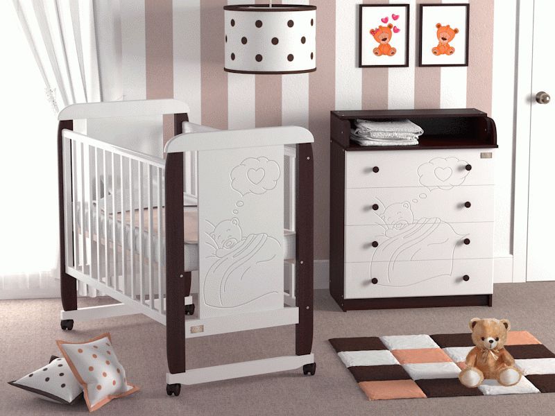 Attention is drawn to its original design. Differs in the style of production - modern. The modernly refurbished bedroom is the perfect place for a crib. Equipped with a chest of drawers, a spacious pull-out drawer for clothes and a changing table. The standard size of the sleeping place is 120 cm x 60 cm. The colors contain classic and original tones, or a combination of them. Special silicone pads are a protector and protect the child. Lowered backrest, height-adjustable bottom.