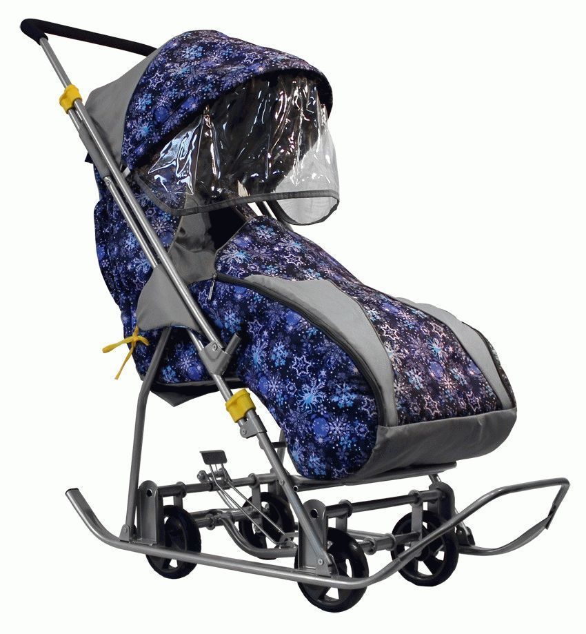 Bottom line: The model has a great beautiful look, the fabric is resistant and decorated with snowflakes, there is a wide range of colors.The average price of a Snegurochka sled carriage is 2,100 rubles.