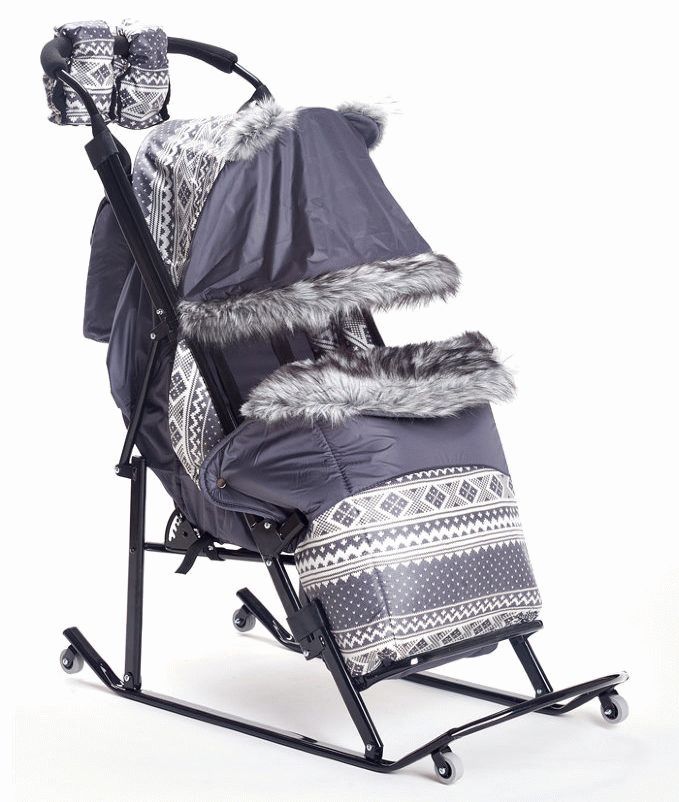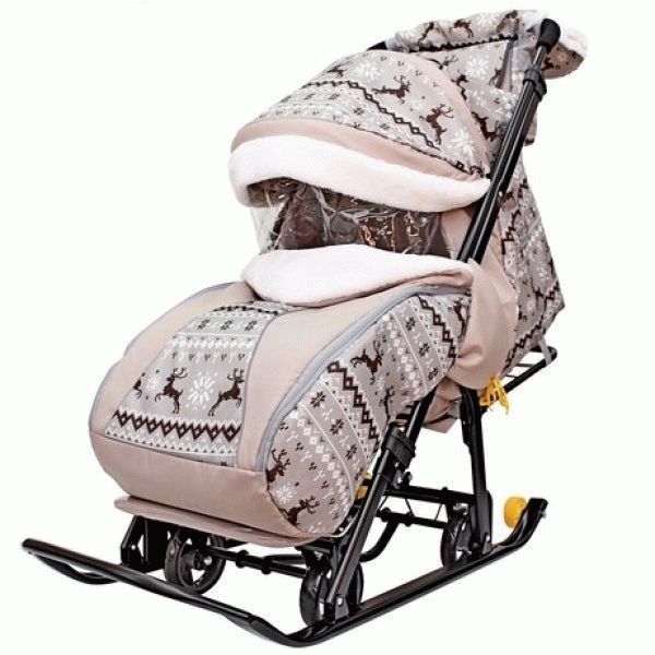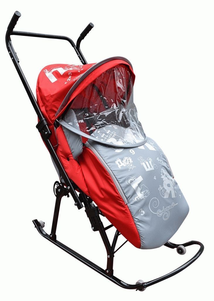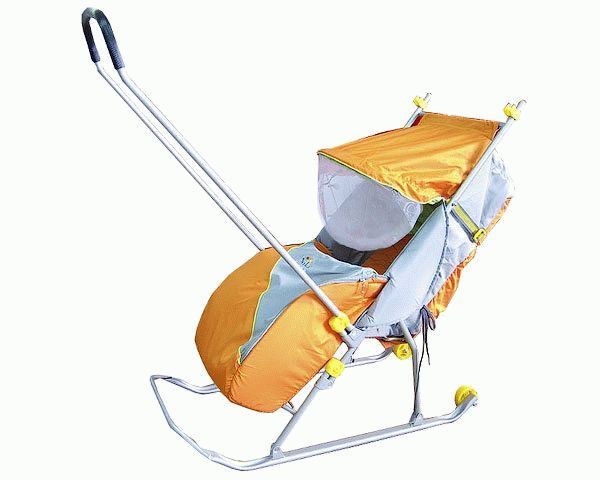 Bottom line: Sleds-strollers are designed to transport babies while sitting, the cover here is made of polyester, this material is wear-resistant and durable. The average cost of a wheelchair with wheels is 1,750 rubles.