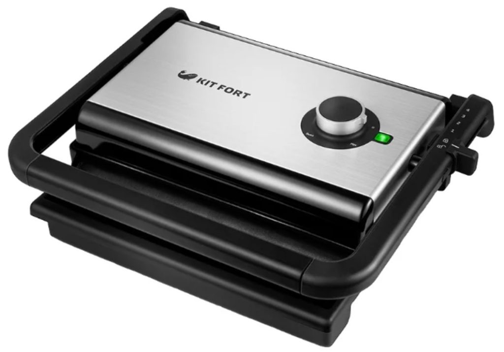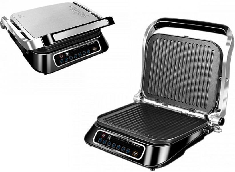 A 2000-watt grill with a stylish design that blends in with modern kitchen interiors. The grill has a grooved surface and a non-stick coating. There is a compartment for fat, a temperature regulator and heating sensors. The grill also features an auto shut-off function in case of overheating. The dimensions of the work surface are 29.7x23.5 cm. The grill can also be used as an open one, but it has one drawback - the plates cannot be removed in it.