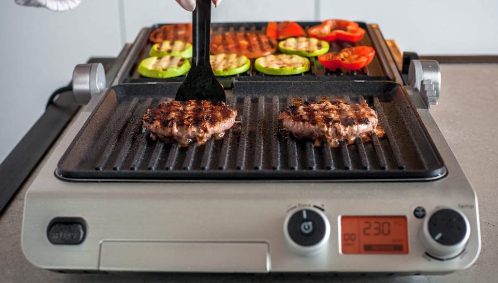 Due to the presence of a sensor operating in automatic mode, the device independently calculates and sets the required time interval, as well as the temperature, guided by the parameters of the thickness and amount of food that are located on the plates.