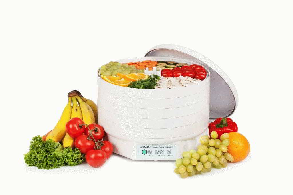 On the first line of the rating we placed the Snackmaker FD500 model of the New Zealand company Ezidri. The power of this unit is 500 W. In one cycle of work, this electric dryer will cope with 7 kg of raw product. This is quite enough for an average family. This drying package includes a base that performs the main function of heating, ventilation and temperature control, 5 round trays, a plastic lid, as well as 1 tray with a net and 1 tray for fruit marshmallows. In addition, a brochure with basic recipes is included with the appliance.