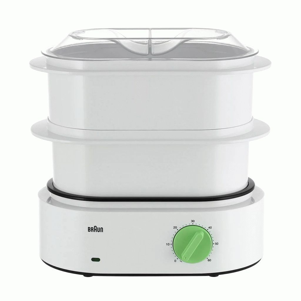 The third place is taken by the Braun FS 3000 model, it is considered one of the representatives of modern technical development, which serves for quick preparation of healthy food. Its frame and baskets are made of smooth plastic, which can be cleaned in a dishwasher. The foldable design on two tiers takes up little space, is equipped with a timer, “Fast steam” mode, a compartment for the power cord and sensors that will notify the user of a lack of water (spontaneous shutdown). The problem can be seen by a special indicator.