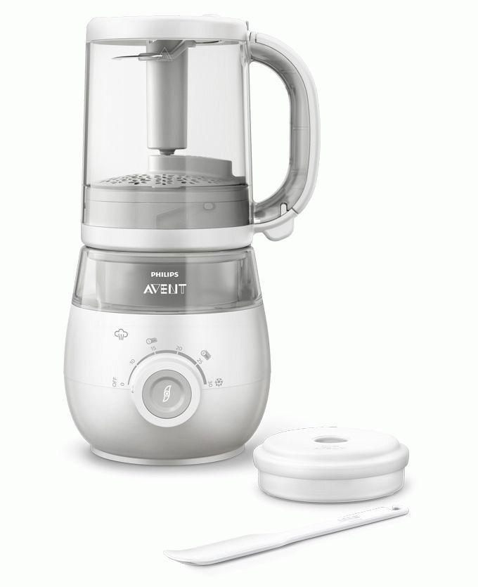 In third place is the well-proven Philips AVENT SC875 blender steamer. It is controlled by mechanical adjustment. It consumes 400 watts. There is a timer function. An audible signal is also present. The construction is made of plastic.As a bonus to the steamer, there is an additional function of heating food and defrosting food. This steamer eliminates the hassle and extra equipment.