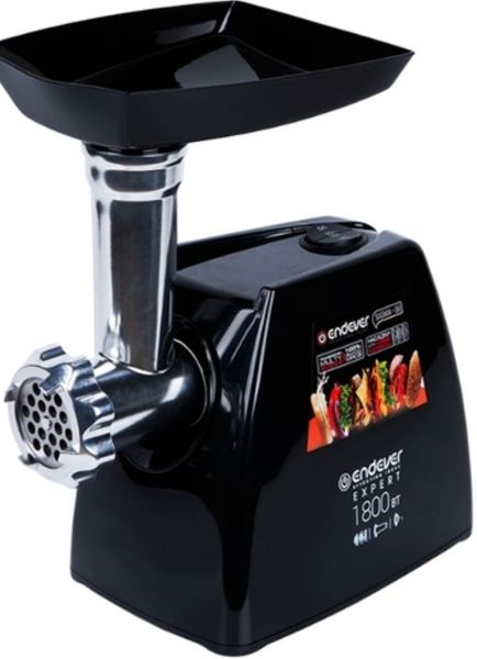 The model with a high power rating of 1800 W and a productivity of 2.3 kg / min is equipped with a reversing system, 5 attachments for sausages, minced meat and kebe, as well as a storage compartment. The length of the power cord is 1 meter. The overall dimensions of the equipment are 24.5x25.2 cm. The body is made of metal and plastic, the trays are metal. The stability of the meat grinder during the working process is ensured by the rubberized legs.