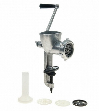 The model measuring 26/15/11 cm and weighing 2 kg 100 g is made entirely of aluminum, the handle has a plastic pad, and all fasteners in contact with the table have rubber pads so as not to damage the table top during work. The unit can not only twist meat, but also make homemade sausages using a special plastic attachment that comes with the delivery.