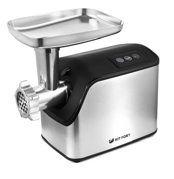 Model with two compartments for storing the power cord and attachments, equipped with 2 minced meat discs, attachments for sausages and kebbe. The body and tray are made of high-strength plastic. The legs are rubberized. It is not difficult to disassemble / assemble the equipment, it can even be washed in the dishwasher. For the convenience of work, a reverse system is provided, there is a pusher.
