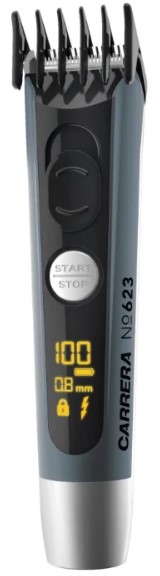 The device, equipped with a rotary motor, has a combined type of power supply and a battery life of about 80 minutes. Has a charging indicator and the time it is declared by the manufacturer is 1 hour. The blades are made of stainless steel and give a cutting length of 0.40 mm, which is regulated by attachments and a special regulator. The package includes a case and 3 types of attachments.