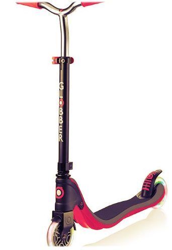 This model is equipped with a sturdy steel frame. The platform is equipped with an EVA anti-slip strip. The scooter has an adjustable T-bar, which easily adapts to human height. The wheels are made of high quality polyurethane materials with a nylon coating and are equipped with LED lighting.